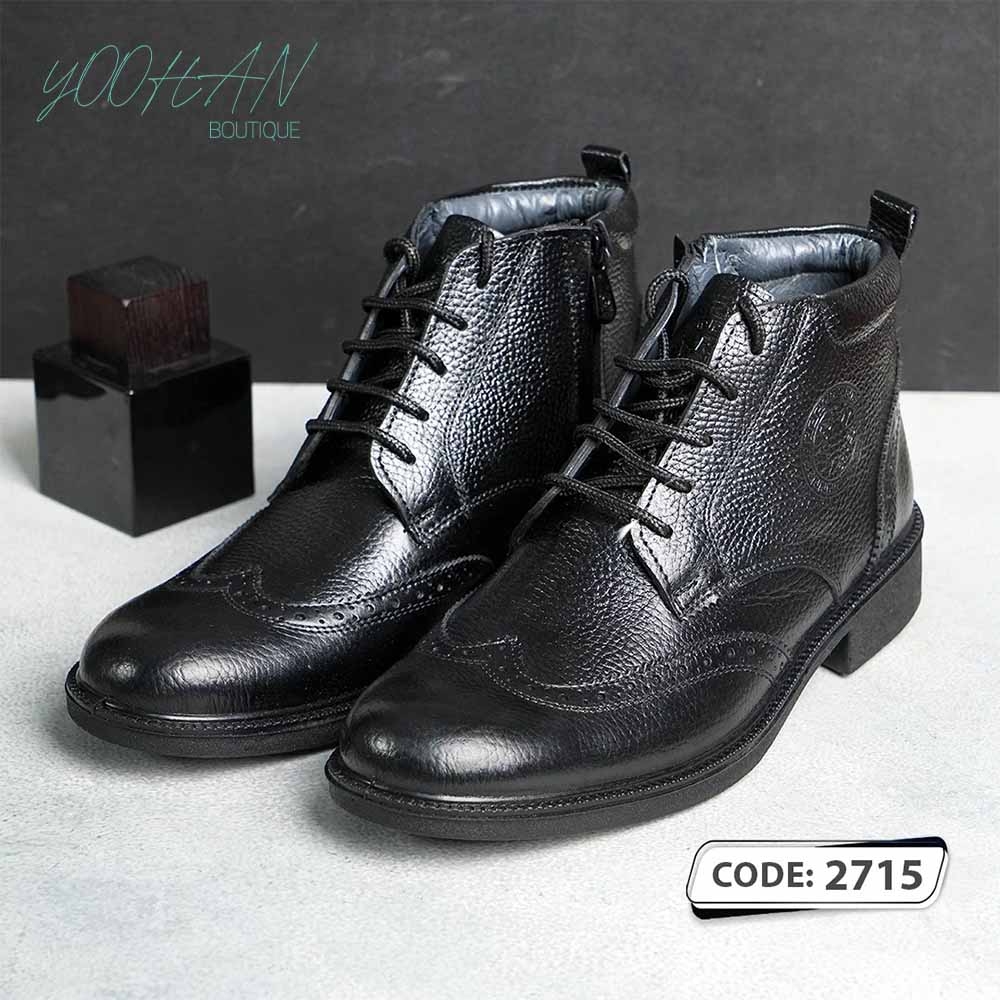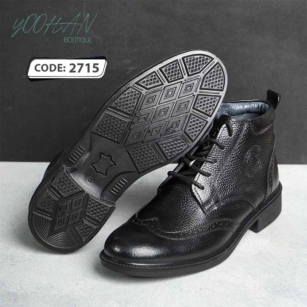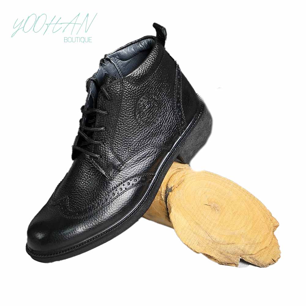 بوت چرم تمام مشکی بندی رویه طرح دار (۲۷۱۵)